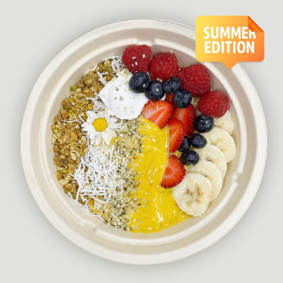 Organic banana, cacao powder, dates, avocado, gluten-free oat milk. Topped with organic berries, coconut yogurt, homemade granola.