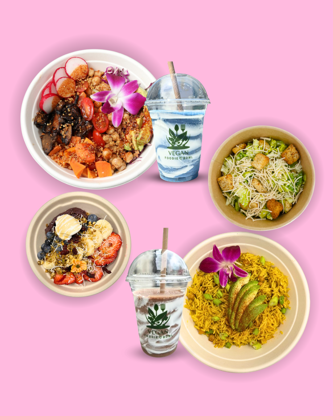 2 rice bowls, 2 smoothies, 1 Caesar salad, and 1 mini acaí bowl.