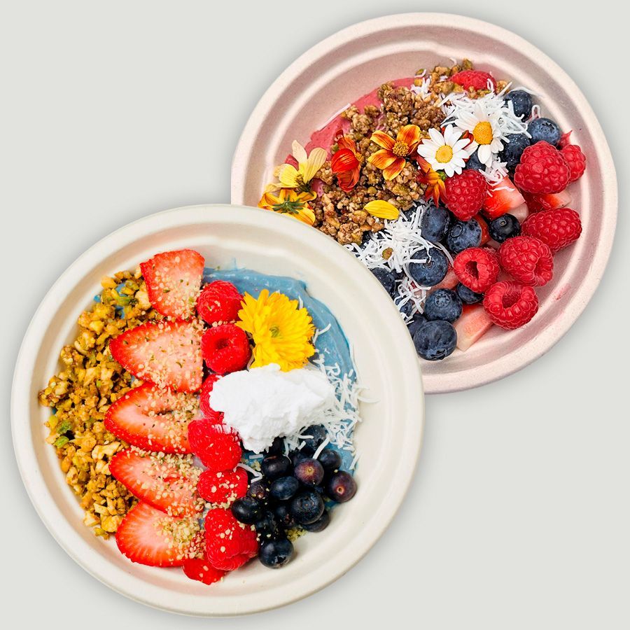 Organic frozen banana, acai puree, gluten-free oat milk, dates. Topped with organic berries, homemade granola, coconut flakes, coconut yogurt, drizzle of honey.